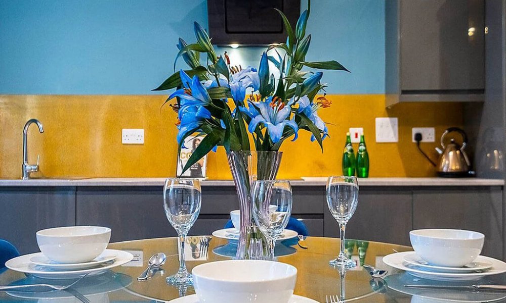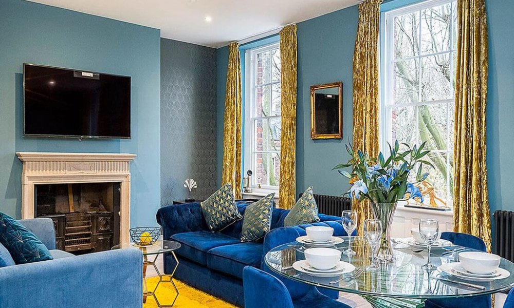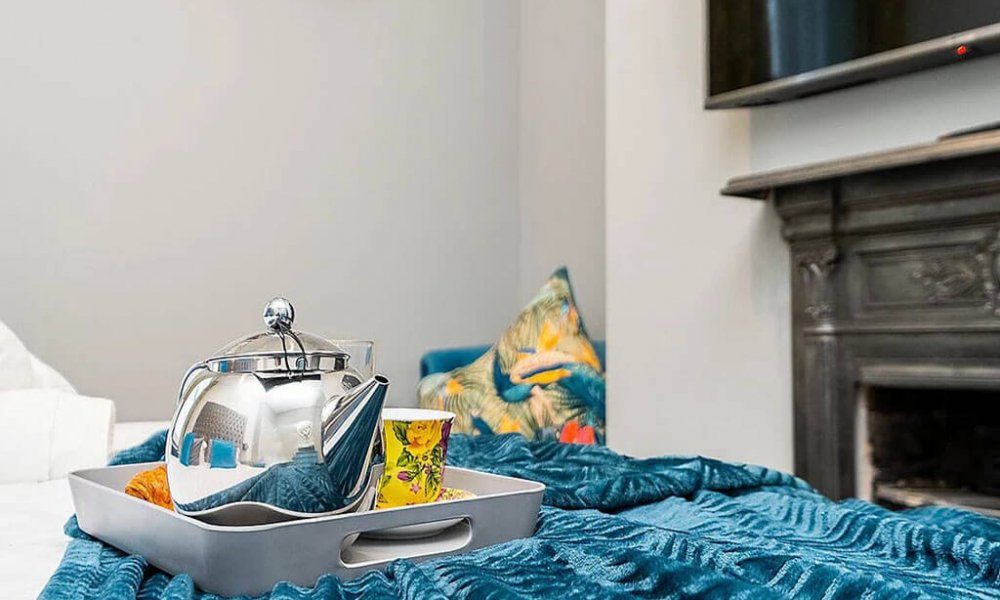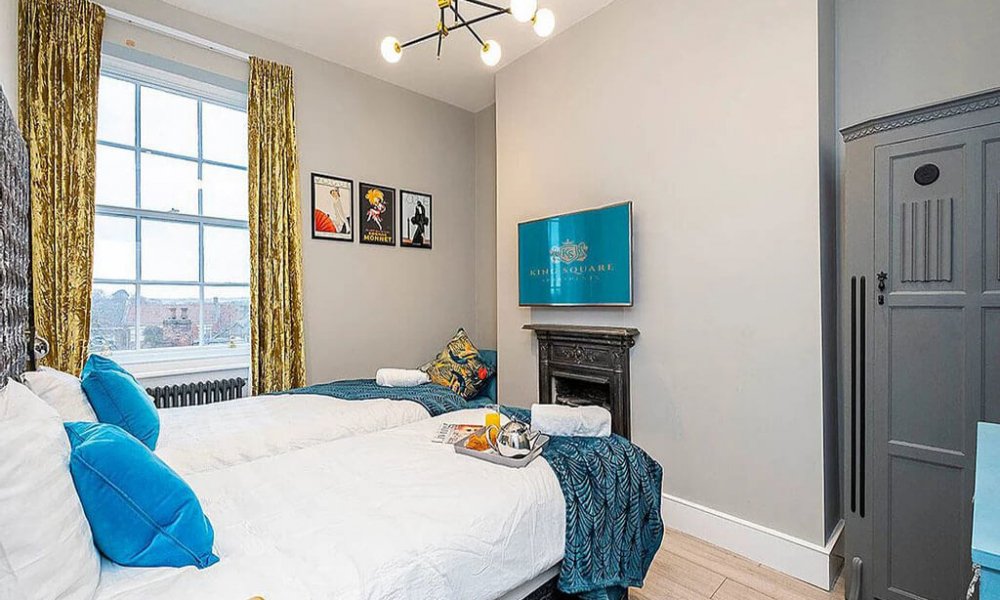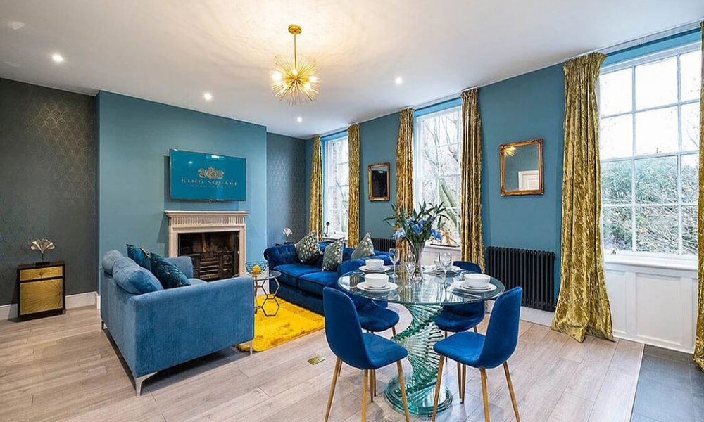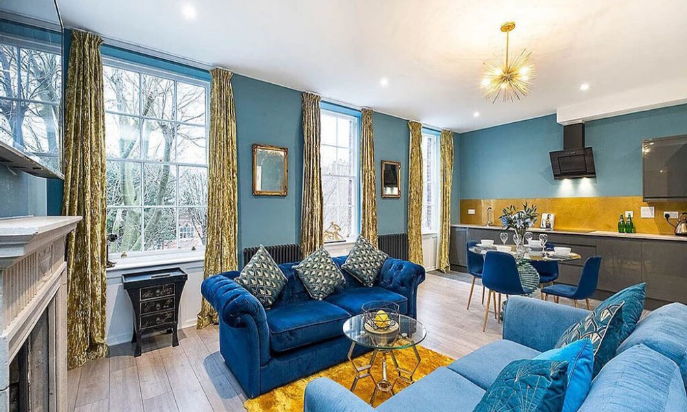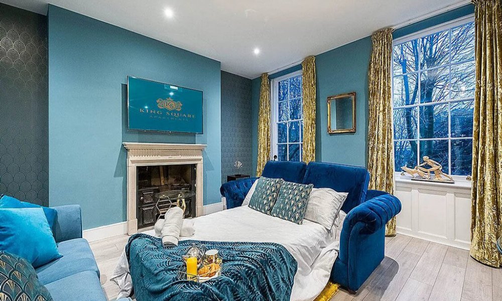 Dark, moody with a hint of gold and shimmer this apartment offers high ceilings and an art deco theme. Enjoy beautiful views of the historical King Square from this second floor suite with a separate living area with a fully equipped kitchen and dining area. Melt into the luxurious sofas while you decide what to watch on the SmartTV, which also includes Netflix. The two sofas conveniently transform into sofa beds, for extra guests in the lounge.