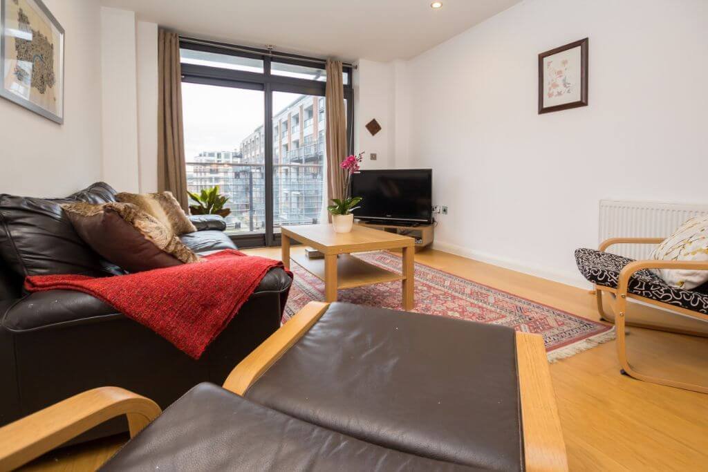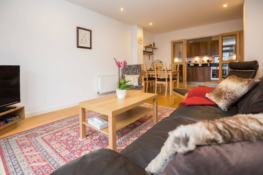 – The lounge is classic and stylish with storage space, a comfortable sofa, Smart TV and a balcony facing the communal gardens.