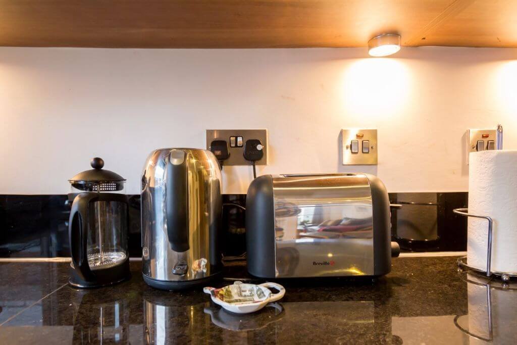 – There is a beautiful dining space with seats for 4 guests. The separate modern kitchen includes all cooking utensils, pots and pans are supplied.