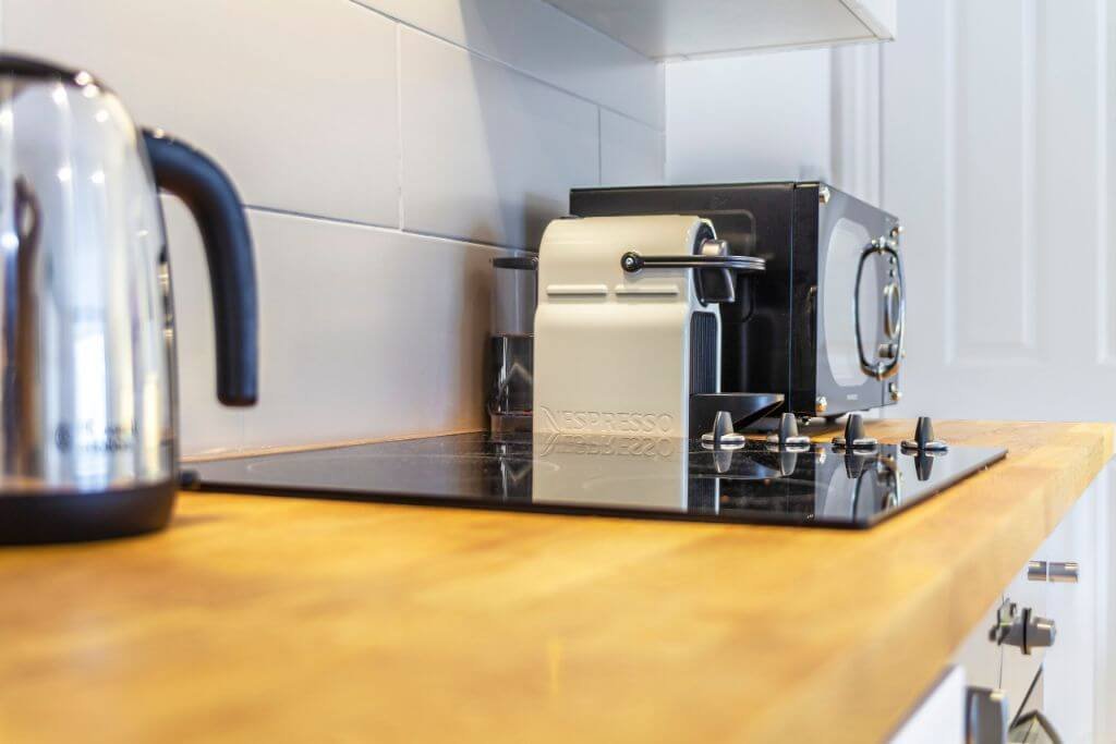 – There is a beautiful dining space with seats for 2 guests. The modern open space kitchen includes all cooking utensils, pots and pans are supplied.