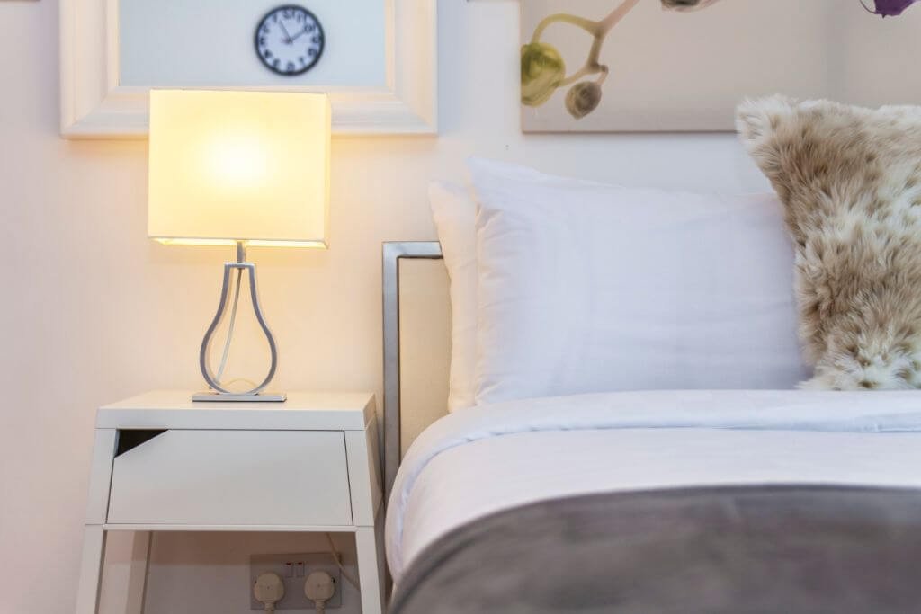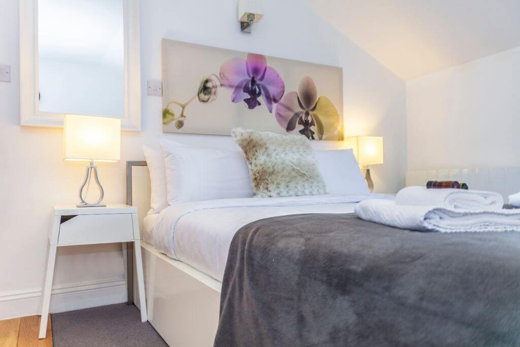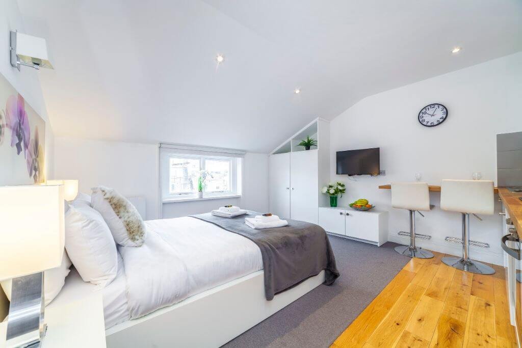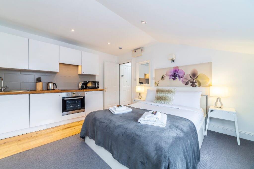 – The bedroom area bright and airy with storage space, the bed is set with fresh hotel-quality linen.