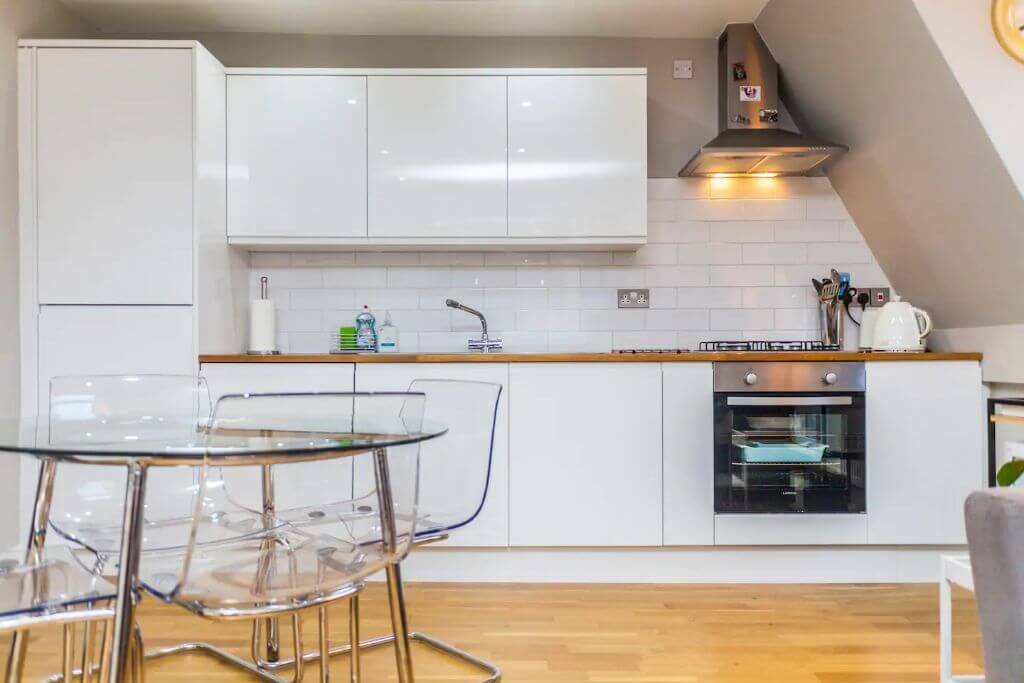 – There is a beautiful dining space with seats for 6 guests. The open, fully-fitted, modern kitchen includes all cooking utensils, pots and pans are supplied.