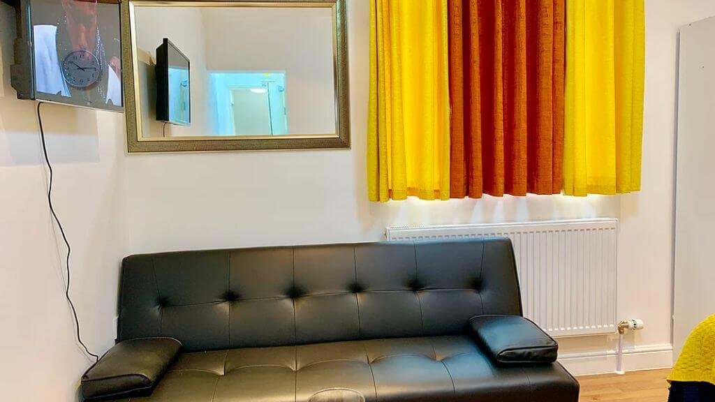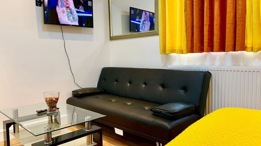 – The lounge is classic and bright with stylish colourful details, comfortable sofa and 65 inches plasma TV.