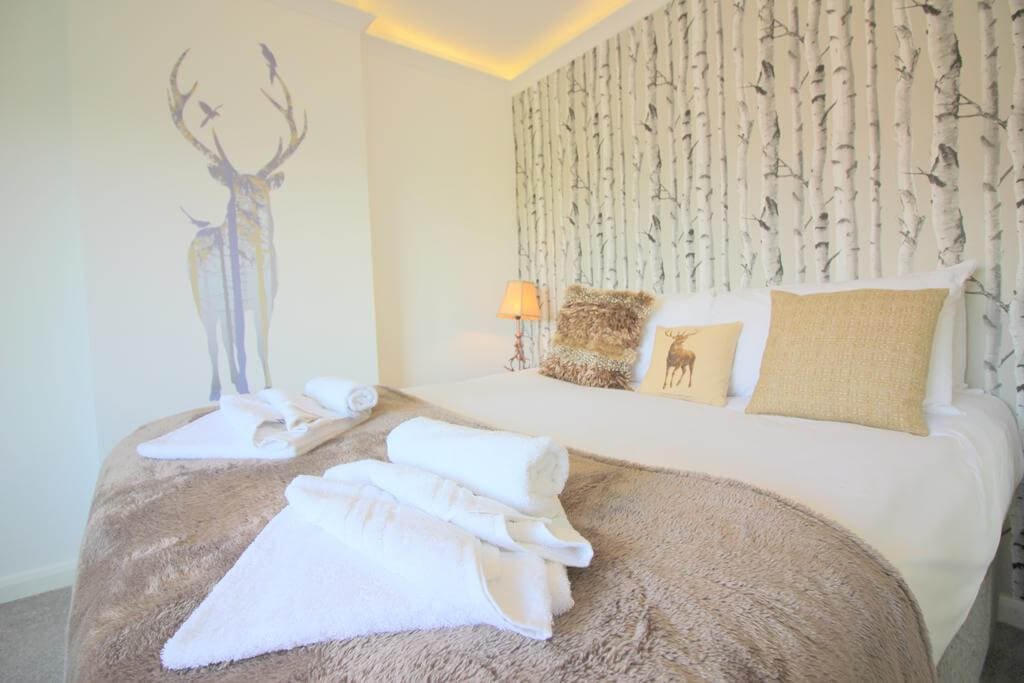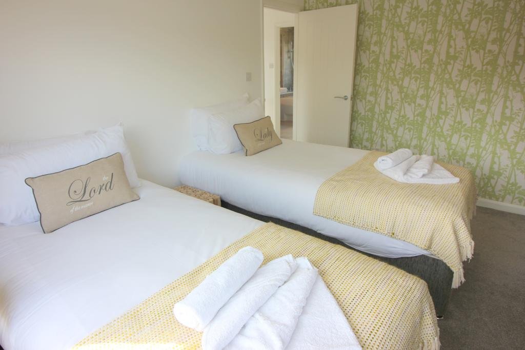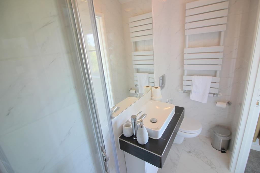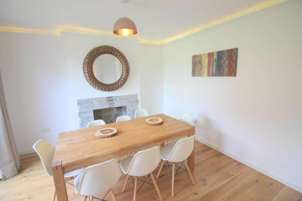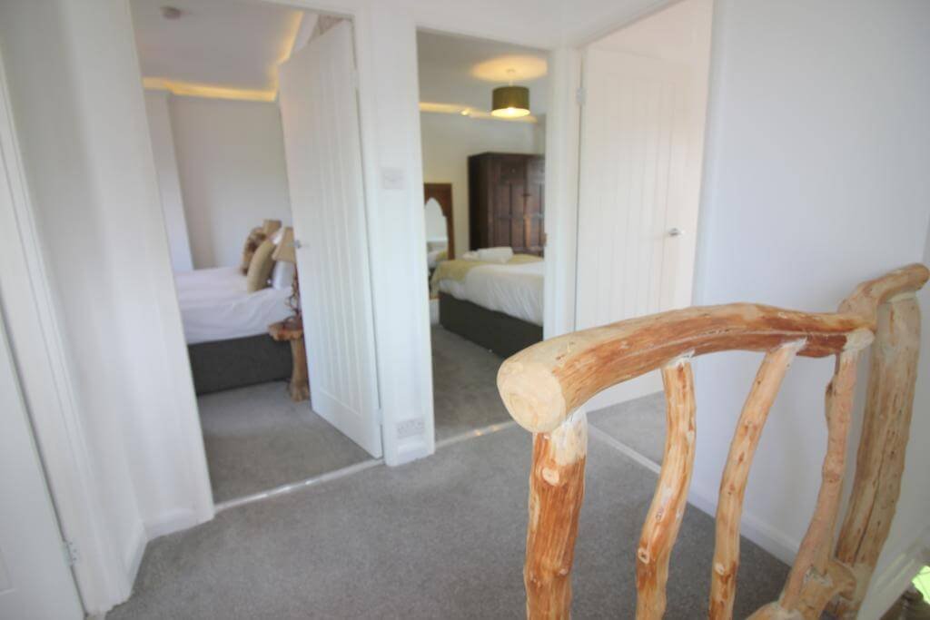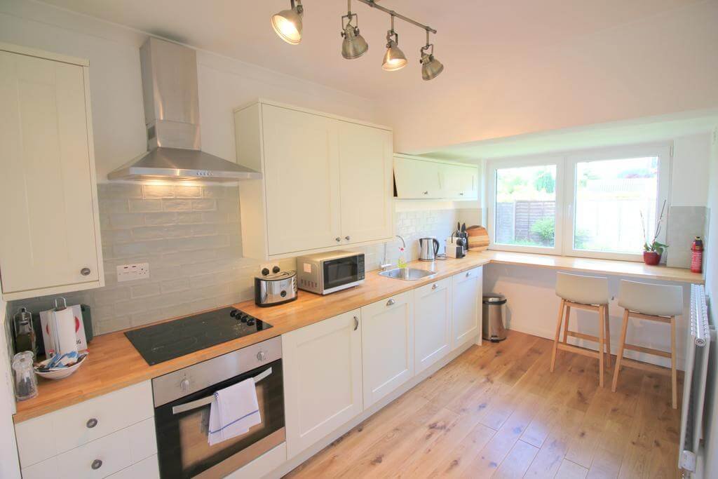 The interior of The Never Land is beautifully designed, with gleaming white walls contrasting against the polished wooden flooring. The wooden staircase handrail, in particular, is a work of art. The master bedroom features a king-sized bed between two wooden bedside tables, while the second bedroom houses two single beds and the third bedroom includes a small bunk bed which is perfect for children. The main bathroom is ultra-modern and clean, featuring a bath and shower with stone tiling throughout. There is a walk-in shower in the second bathroom. A large separate kitchen boasts wooden worktops and features an oven, microwave, dishwasher, and large fridge/freezer. A variety of clean cooking utensils and cutlery are also included. There is a separate dining area that features a large wooden dining table and leads to the garden through glass sliding doors. The lounge area is bright, well-lit and spacious with comfortable seating and a flat-screen TV.
