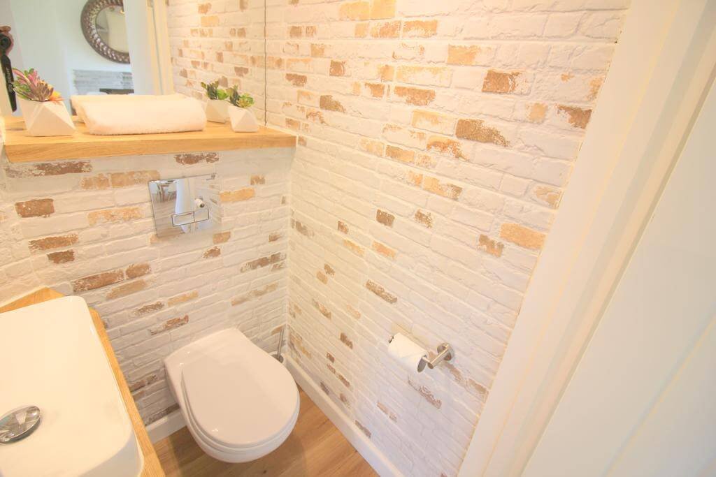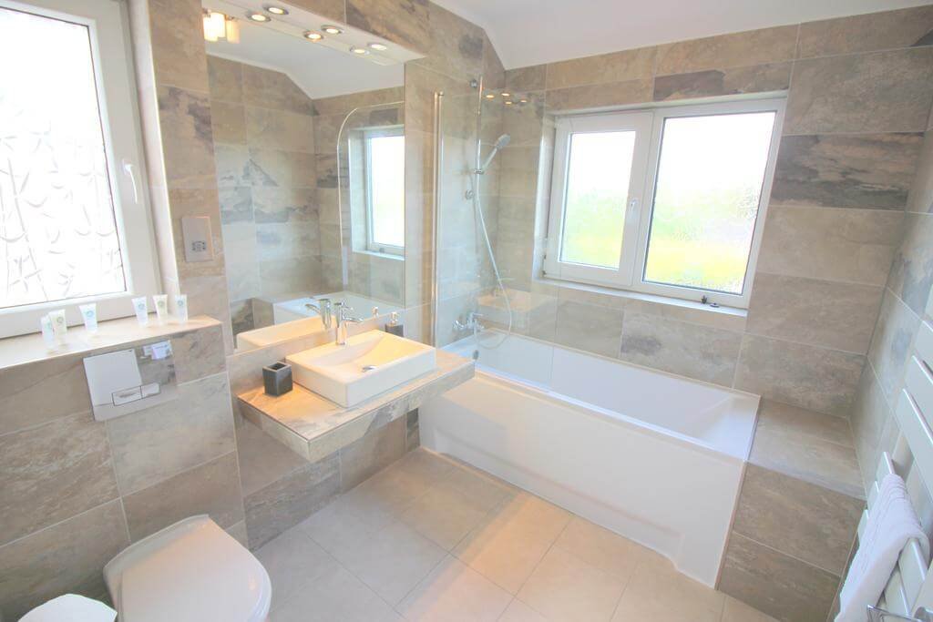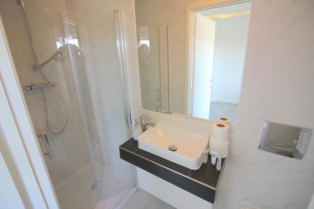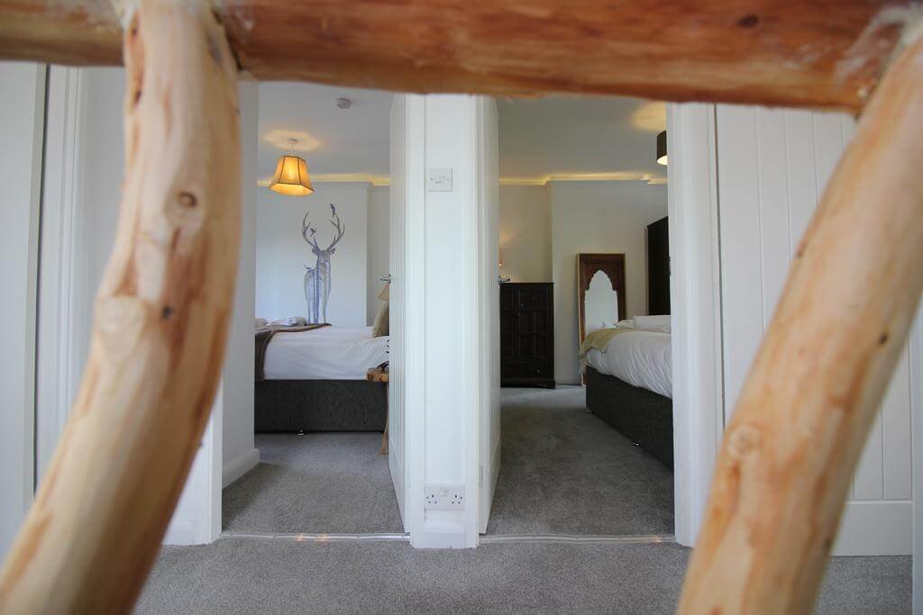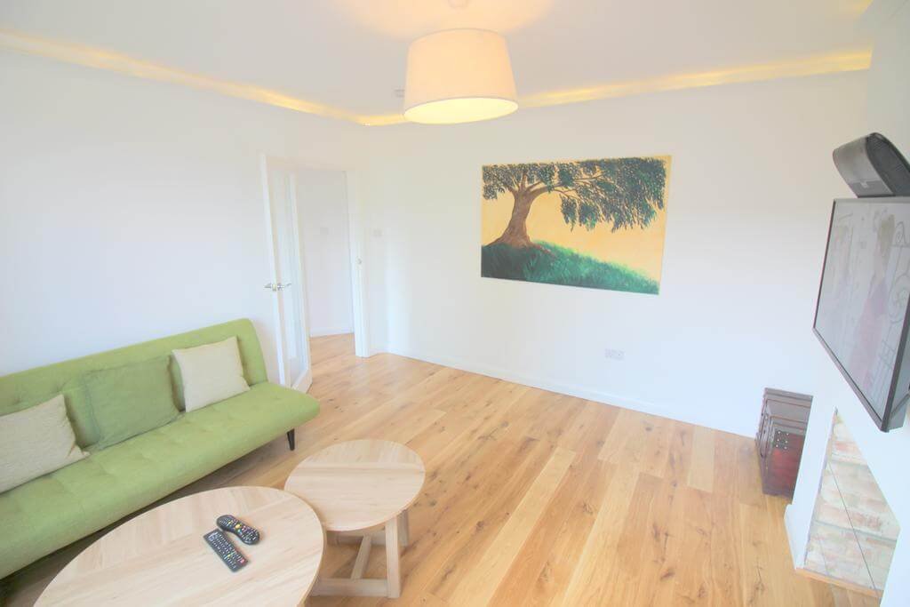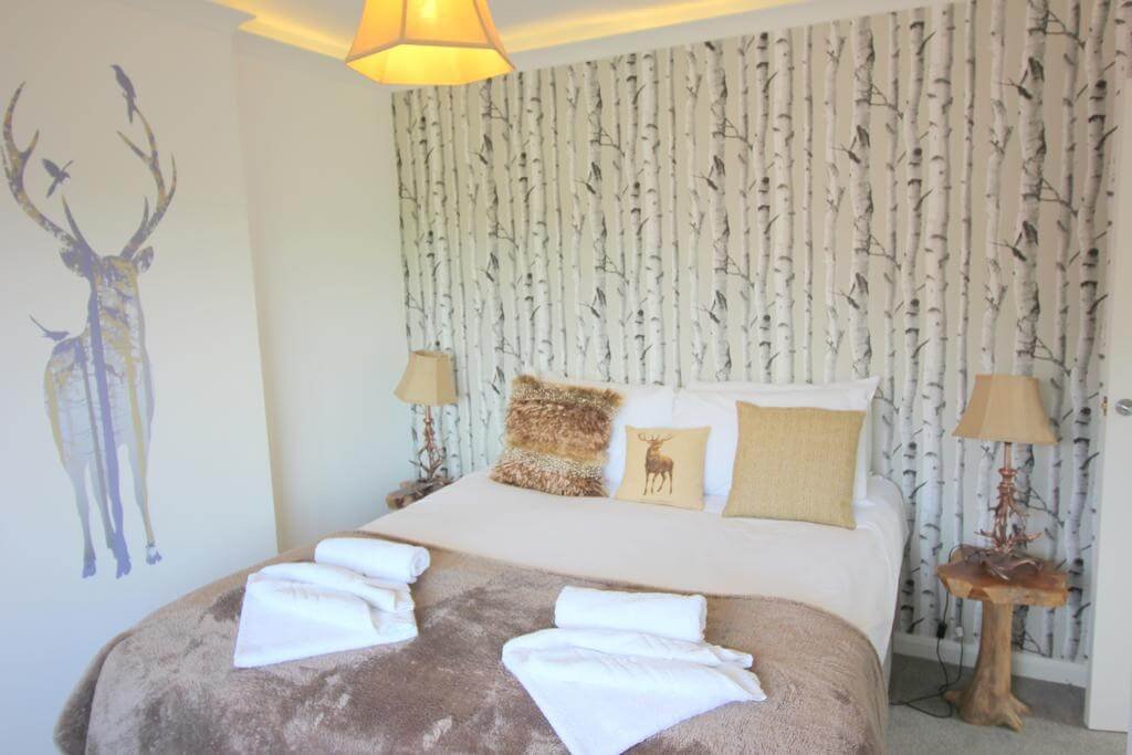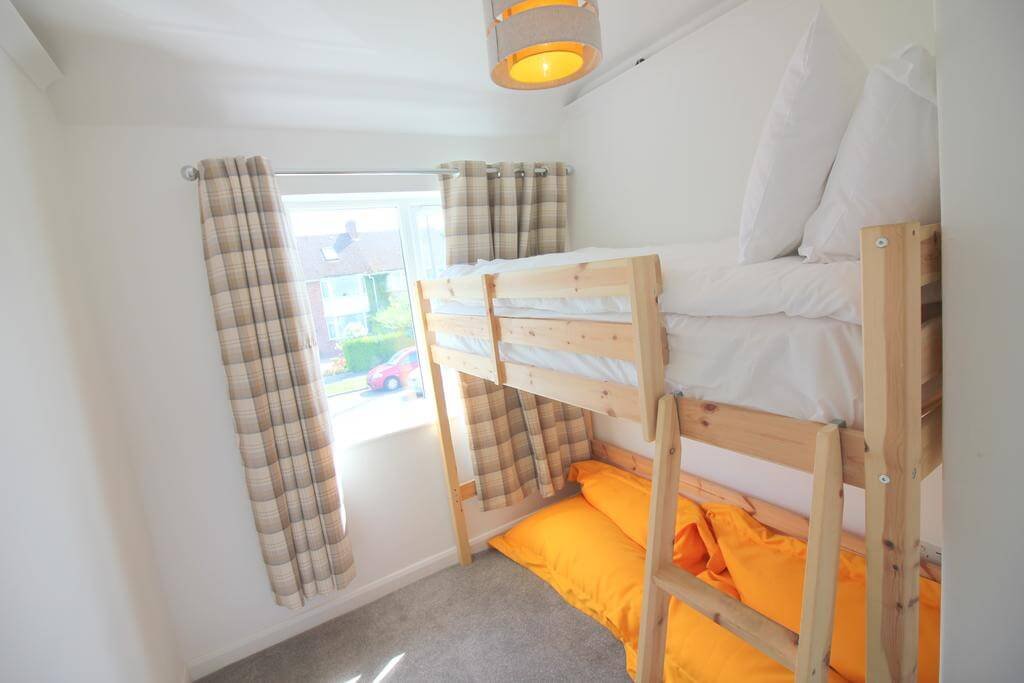 The interior of The Never Land is beautifully designed, with gleaming white walls contrasting against the polished wooden flooring. The wooden staircase handrail, in particular, is a work of art. The master bedroom features a king-sized bed between two wooden bedside tables, while the second bedroom houses two single beds and the third bedroom includes a small bunk bed which is perfect for children. The main bathroom is ultra-modern and clean, featuring a bath and shower with stone tiling throughout. There is a walk-in shower in the second bathroom. A large separate kitchen boasts wooden worktops and features an oven, microwave, dishwasher, and large fridge/freezer. A variety of clean cooking utensils and cutlery are also included. There is a separate dining area that features a large wooden dining table and leads to the garden through glass sliding doors. The lounge area is bright, well-lit and spacious with comfortable seating and a flat-screen TV.