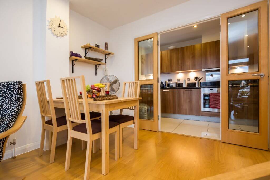 – There is a beautiful dining space with seats for 4 guests. The separate modern kitchen includes all cooking utensils, pots and pans are supplied.