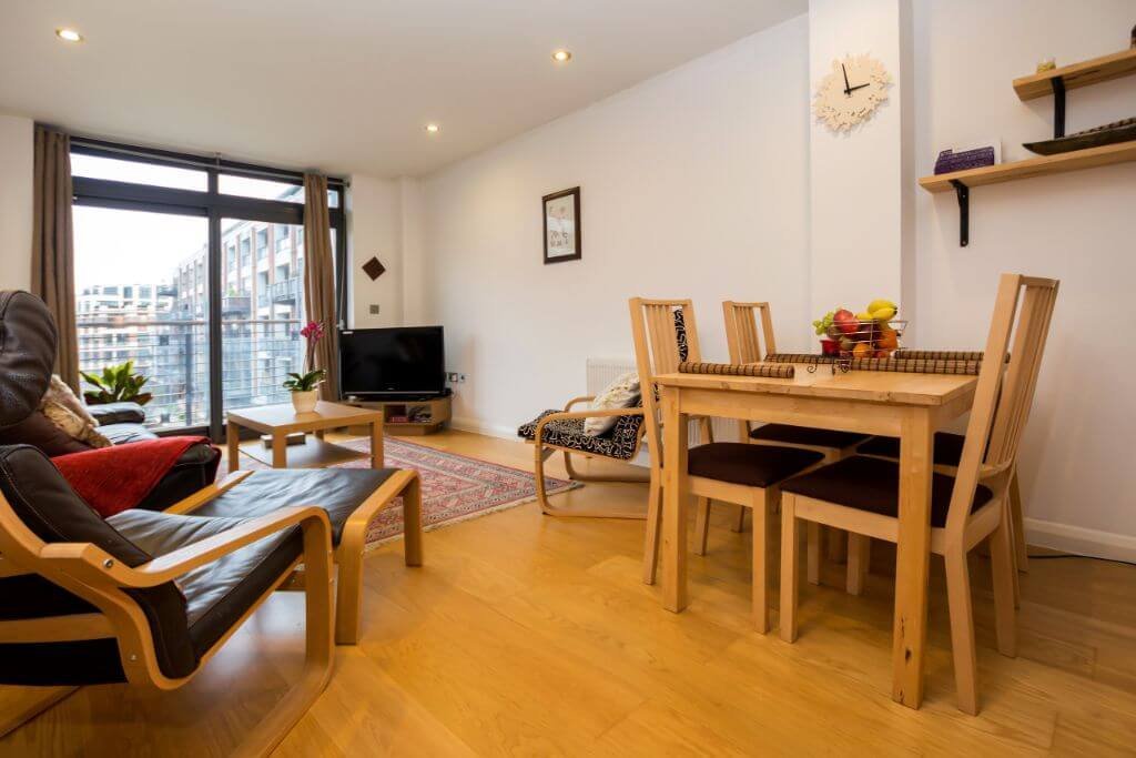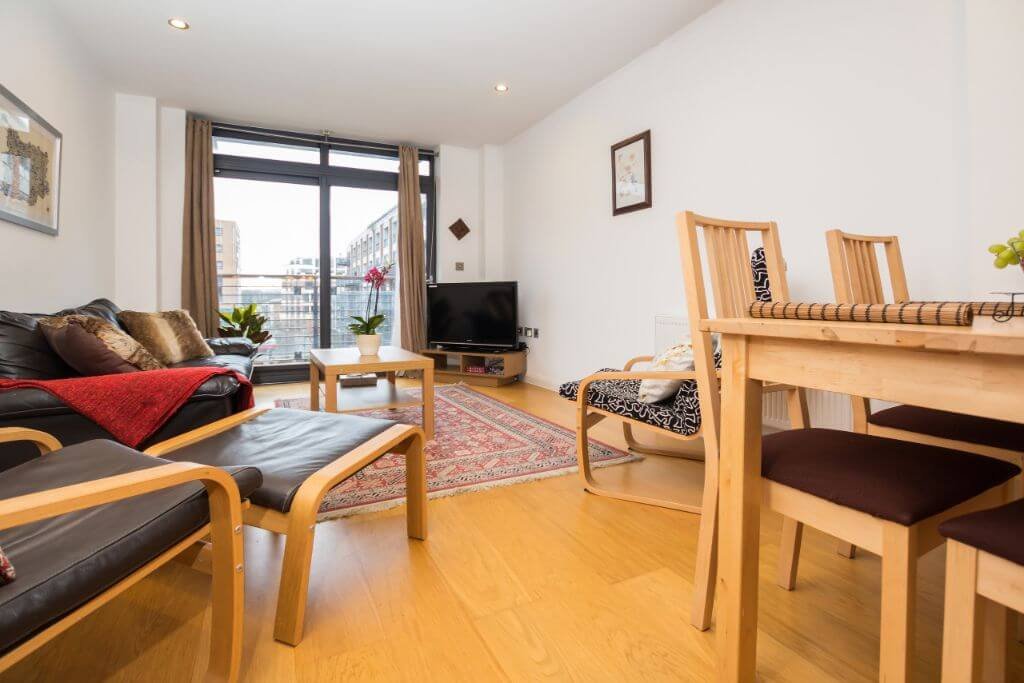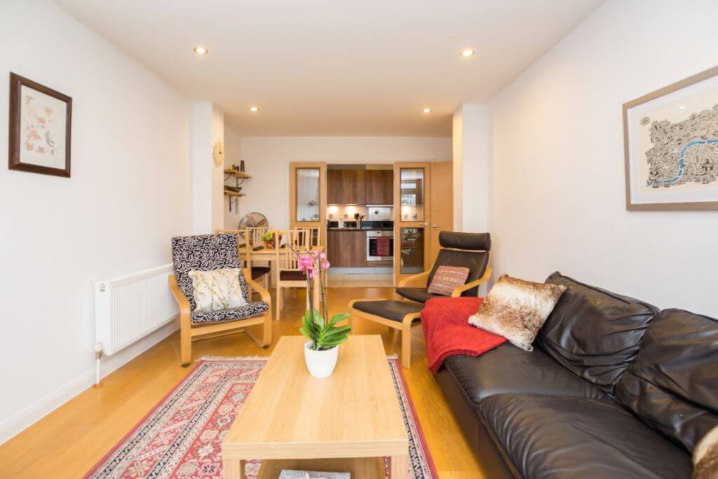 – The lounge is classic and stylish with storage space, a comfortable sofa, Smart TV and a balcony facing the communal gardens.