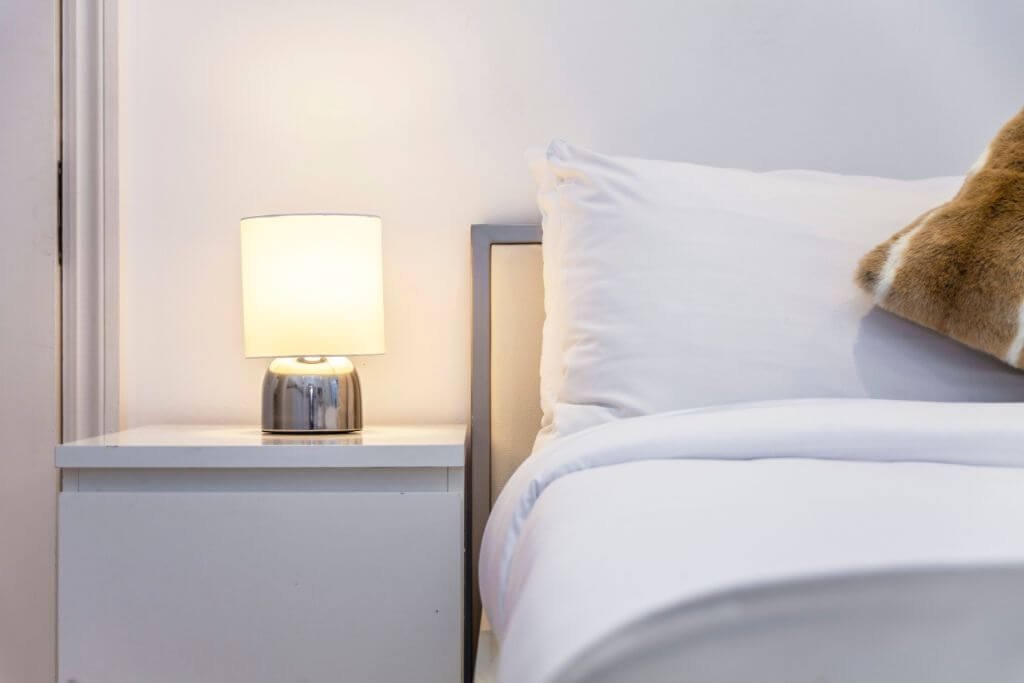 – The bedroom area bright and airy with storage space, the bed is set with fresh hotel-quality linen.
