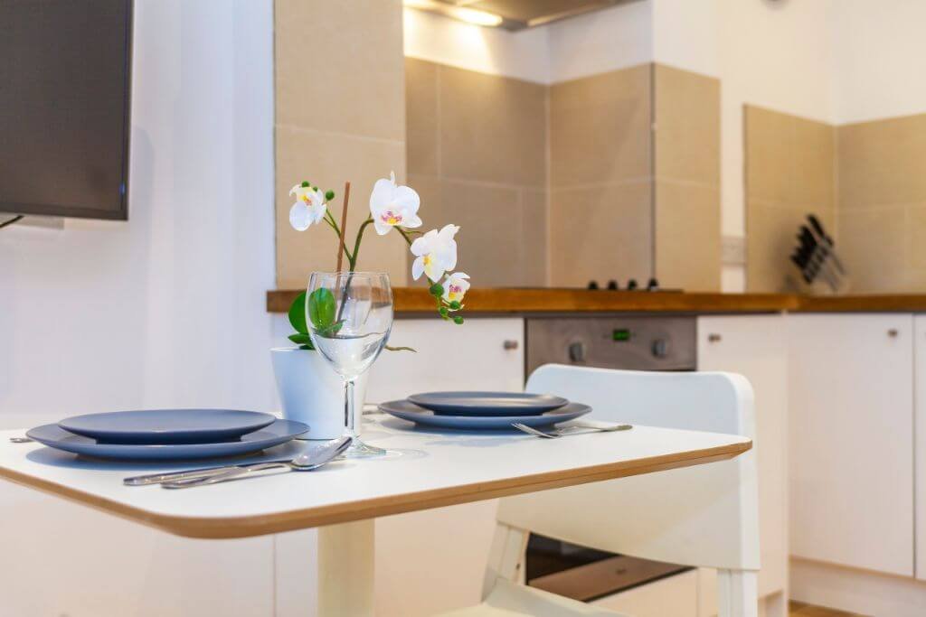 – There is a beautiful dining space with seats for 2 guests. The modern open space kitchen includes all cooking utensils, pots and pans are supplied.