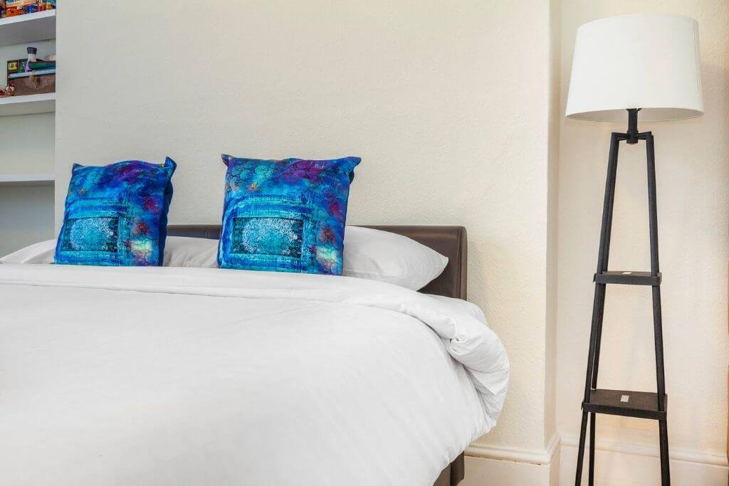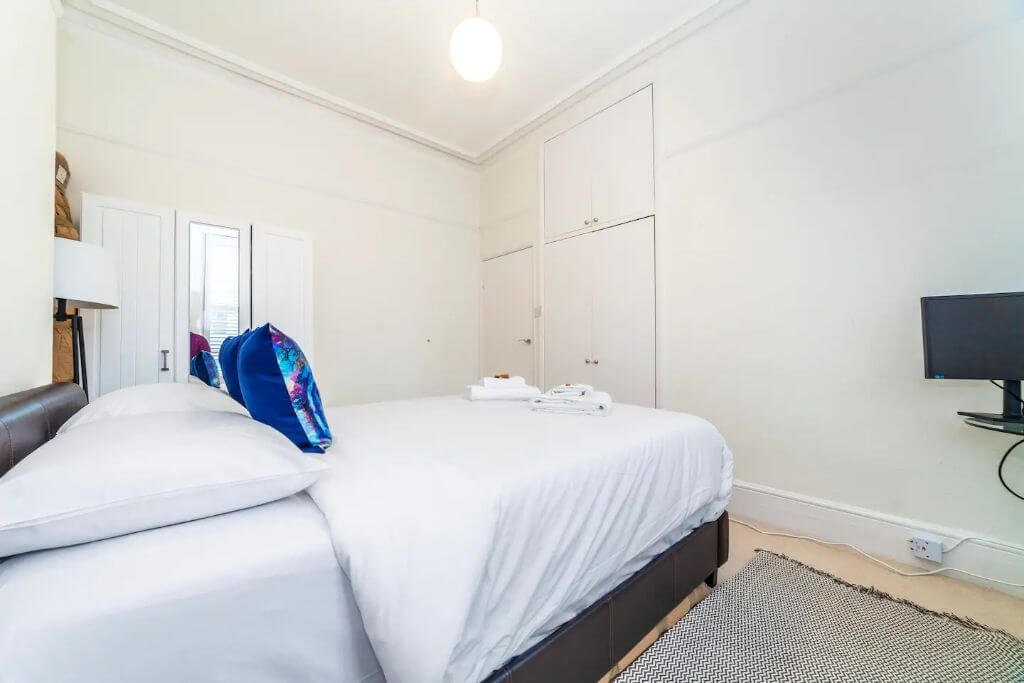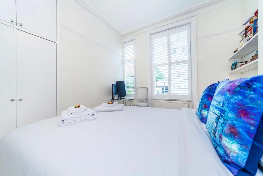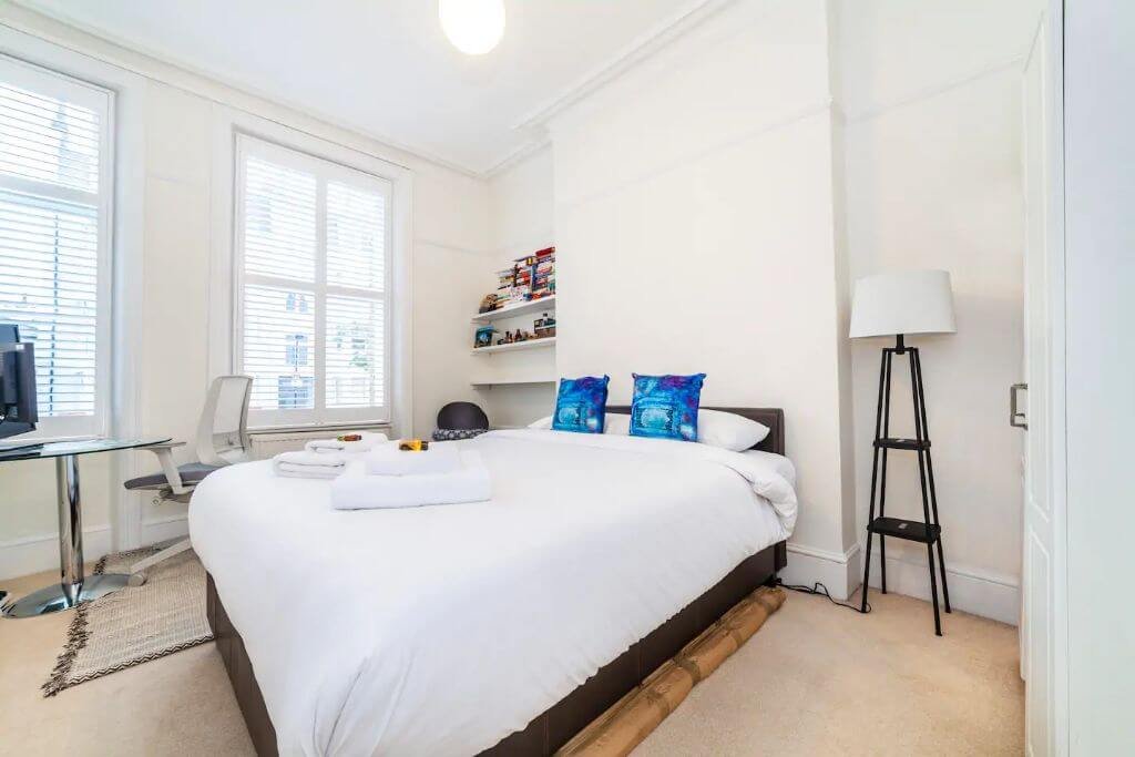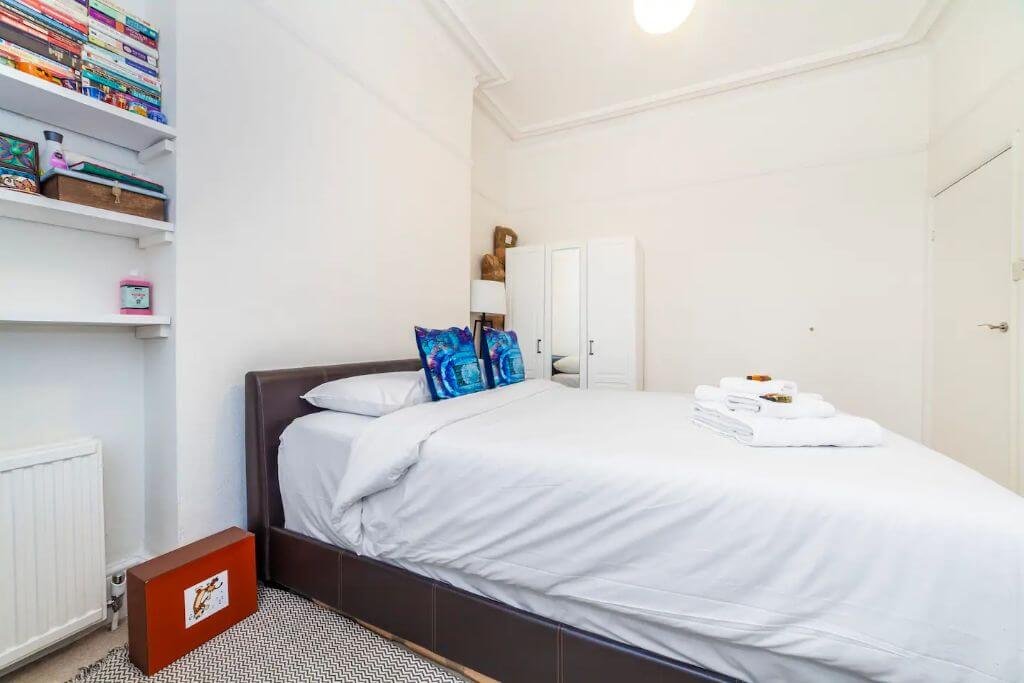 – The bedroom boasts a queen-size bed with a satisfying memory foam mattress and a nice separate workspace for easy remote working. The bed is set with fresh hotel-quality linen and there is plenty of storage space.