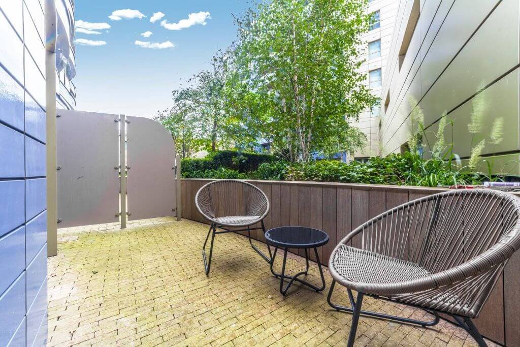 – The double bedroom is bright and airy with storage space and garden access, the bed is set with fresh hotel-quality linen.