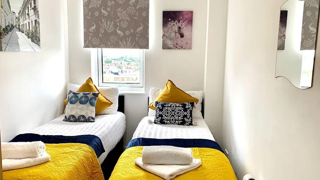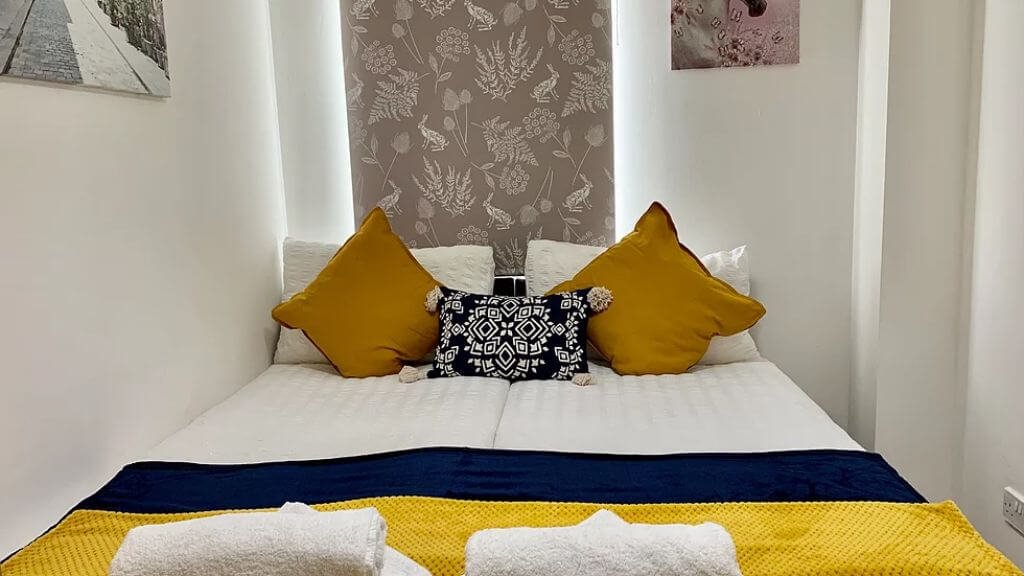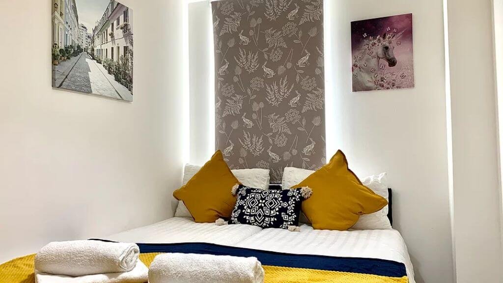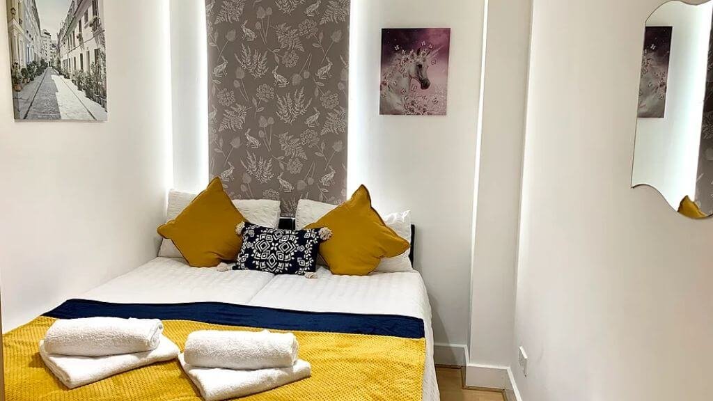 – There are four bedrooms, one single (study room mentioned above) on the first floor, master en-suite bedroom and double bedroom on the third floor, one more en-suite bedroom on the fourth floor. All boast storage space, the beds are set with fresh crispy hotel-quality linen.